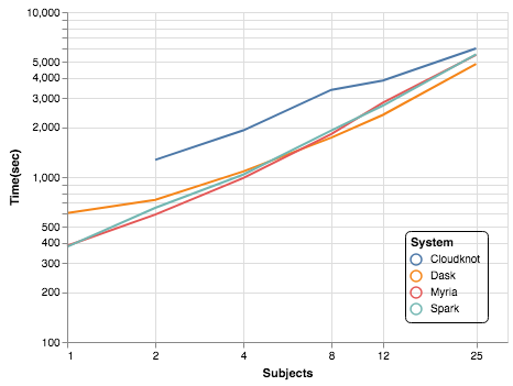 Compare to Dask, Myria, Spark using previous benchmark study.
